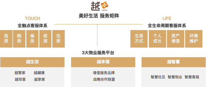 越秀服务以客户诉求为导向,成功打造多维度服务矩阵:“TOUCH全触点”服务体系以早介服务、案场服务和社区服务等为依托,在客户选房、购房、候房、收房到住房的全过程中提供悦心服务,致力打造美好生活的居住场景;“LIFE全生命周期”服务体系则秉承为“业主房产保值、增值”的服务理念,聚焦业主关注的“生活方式(Living)、个人成长(I)、资产增值(Finance)、环境维护(Environment)”四大维度,在确保小区环境赏心悦目的基础上,挖掘居住的深层次价值,为业主提供高品质、有特色的“越”式服务。
