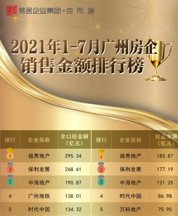 《2021年1-7月广州房企销售榜》发布,越秀地产蝉联两项第一